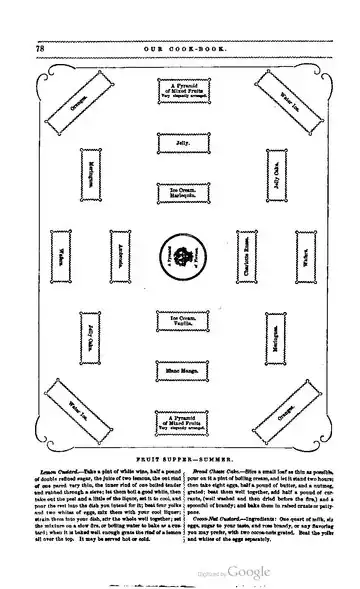 FRUIT SUPPER—SUMMER. Lemon Custard—Take a pint of white wine, belt a pound of double refined sugar, the juice of two lemons, the out rind of one pared very thin, the inner rind of one boiled tender and rubbed through a sieve; let them boil ngood while, then take out the peel and a little of the liquor, set it to cool, and pour the rest into the dish you intend for it; beat four yolks