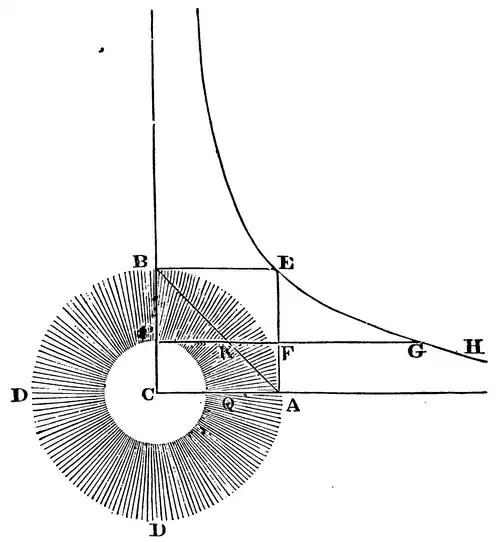 density of the light in any place P, will, by my computation, be as the line FG, and therefore at the centre infinite, but near the circumference very small. And the whole light within the small circle PQ is to the without as the area of the quadrilateral figure CAKP to the triangle