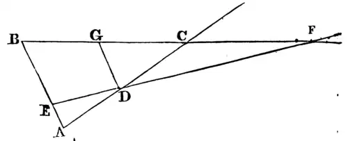 Let AB, AC, BC, be the right lines given in position, and suppose D to be the given point in the line AC. Parallel to AB draw DG meeting BC