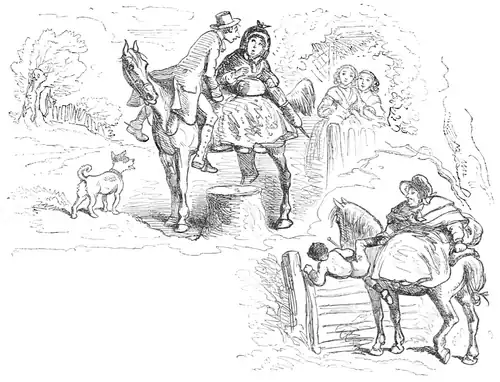 Like all other partnerships, though in a greater degree than most, the pleasure of riding double was dependent upon being suitably matched. Nothing, for instance, could look more incongruous than a large woman seated on a pillion behind a little man, especially as the thick cushion, provided for her use, was always much higher than the saddle before it. A boy was sometimes sent to escort a portly matron in this way, of which a curious instance occurred under the observation of a friend of mine. She had been struck with the length of time that a horse remained at a gate upon the road near her residence, and looking out more intently to ascertain the cause, she perceived a large female-figure seated on a pillion behind; but, to all appearance, a vacant saddle in front. On further investigation, however, she discovered that an extremely little boy was stretching himself downwards to open the gate, but in vain, the horse being an animal of more than usual height. The majestic dame, however, was not one to be baffled by a difficulty of this kind; so, reaching out her powerful arm, she held the little boy by one leg while he unfastened the gate, thus securing his safe reinstatement in the saddle.
