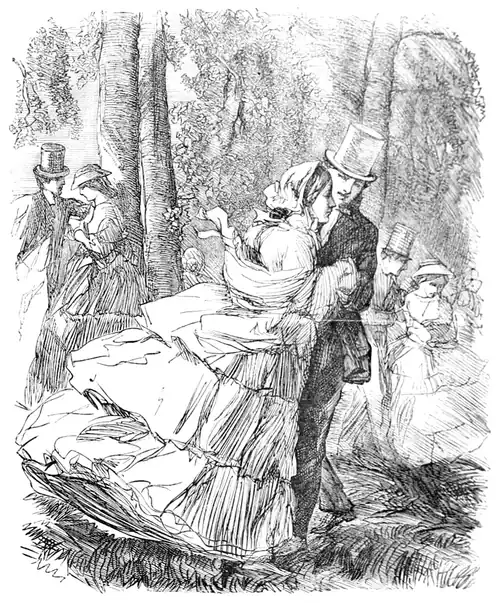The dowagers were now firmly planted on Olympus. Along the grass lay warm, strong colours of the evening sun, reddening the pine-stems and the idle aspen-leaves. For a moment it had hung in doubt whether the pic-nic could survive the two rude shocks it had received. Happily the youthful element was large, and when the band, refreshed by chicken and sherry, threw off half a dozen bars of one of those irresistible waltzes that first catch the ear, and then curl round the heart, till on a sudden they invade and will have the legs, a rush up Parnassus was seen, and there were shouts and laughter and commotion, as over other great fields of battle the corn will wave gaily and mark the re-establishment of nature’s reign.