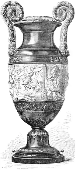 Like every really great artist, who leaves nothing undone to render his work perfect, he has himself watched over every detail, designed the form, and superintended the casting of the metal, carved the ivory, and moulded the embossments of the bronze. His vase may be open to criticism; opinions on matters of taste must of necessity be infinite in the absence of any recognised standard. Some may think the upper part too bald, others may desire even less ornament and a more simple shape; some may object to the introduction of ornaments too closely imitated from nature, others to the union of two substances so opposite in character as ivory and bronze. But the artist himself has duly weighed all these things, and has made up his own mind. By the massiness of the handles he seeks to indicate that they are intended not simply for show, but for use in lifting the vase. As any apparent weight added to the upper part might be inconsistent with the light and apparently fragile material which forms the centre, he has abstained from introducing into it any more ornament than he deemed absolutely necessary; convinced that, in order to invent new and truly noble forms of decoration, we should turn to the inexhaustible mine of nature, he has sought in natural objects the ornaments which he has embossed on the handles and lip. A work carried out in this spirit and upon these principles, and with a conscientious care seldom equalled, cannot fail to be an object of value and interest deserving of serious study.