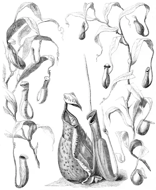 The plant on the left in the plate is Nepenthes distillatoria, the first species introduced to Europe. The length of its pitcher is equal to those of Rafflesiana, but it is much less capacious. The neck and upper part are exceedingly graceful and almost classical in form. The aperture and lid are circular, and about an inch in diameter. The colour is a rich yellow, shading into red in the upper parts. The attractiveness of this species is increased by the tendency of the cirrhus to curve and form one or two rings, as is often seen in the tendrils of the vine.