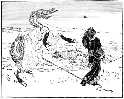 A Japanese Lady, famous for her courage and strength, calmly surveying a landscape whilst standing on the halter of a very restive steed. (Fac-simile.)