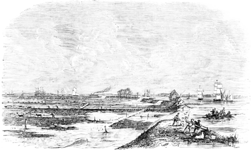 It fell to our lot to witness such an instance in—as we recollect—the year 1852. Some such a combination of untoward atmospheric phenomena as occasioned the frightful catastrophe at the Hondsbossche, in Holland, in 1287, had heaped up the waters of the North Sea to such an extent, that when the spring tides came round, and a long continuance of wet had set an inordinate gush of upland waters running down the river, we happened to journey from Rosherville to London in one of the old Gravesend steamers, and to arrive in Halfway Reach about the top of high-water. We were invited up on the paddle-box by a civil and somewhat scientific captain, and introduced to one of the strangest scenes we had ever witnessed. Right and left lay the marshes, 17 feet at least below our vessel’s water-line, and consequently some 31 feet below the level of our eye, stretching their monotonous level far away up to the stems of the trees which skirted the rising grounds. Between them the river seemed buoyed up, as in a basin, by the river walls: over these, in a dozen places between Erith and Woolwich, cataracts were pouring down the inner sides of the slopes, and slowly pushing a sheet of water further and further up into the marshes. Herdsmen, in every variety of excitement, were gathering together, and driving towards the rising lands the hundreds of head of cattle which had but a short time before been grazing in peace without a thought of danger; whilst other excited groups, with ready boats at hand, were dotted along the top of the wall in suspicious places, eagerly engaged in efforts to fend off the flood with planks, and buckets of earth, and sods, and extemporised clay fortifications, for the very short period during which the water could remain at its height. The determined stand made at the entrance of the Halfway House—a remote river-side inn, seen in our illustration—with planks and clay, was worthy of all praise, and it proved, we are glad to be able to add, successful.