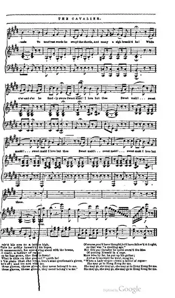Of course,youM have thought,he'd have follow'd & fought* As that was "a duelling age," But this guy Cavalier he quite scorn'd the idea Of putting himself in a rnge. More wise by far, he put up his guitar J And as homeward he went, Bunghe, "When a Lady elnpp?—down a ladder of ropesShe may go to Hong Kong for me. She may go, she may sro, she may go to Hong Kong forme. She may go, she may go, she may go to Hong Kong for me.