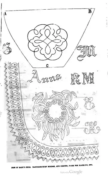 TOE OF BABY'S SHOE. HANDKERCHIEF BORDER , AND CORNER, NAME FOR MARKING, ETC.