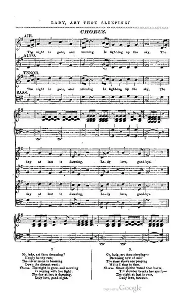 2 Oh, lady, art thou dreaming ? Happy be thy rest ; The silver moon is beaming Down the distant west : Chorus. The night is gone, and morning Is coming with her light ; The day at last is dawning, Lady love, good-night.