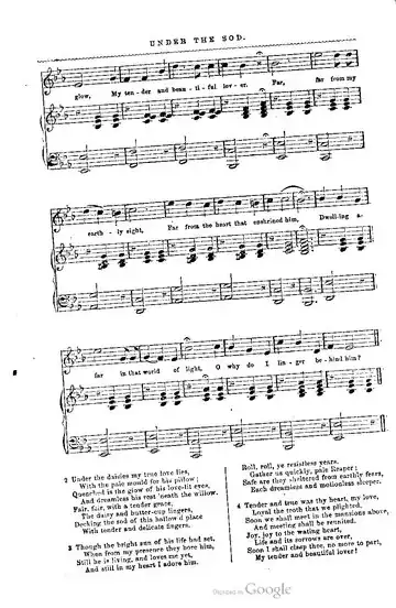 2 Under the daisies my true love lies , With the pale mould for his pillow ; Quenched is thesglow of his love - lit eyes , And dreamles his rest ' neath the willow . Fair, fair , with a tender grace , The daisy and butter-cup lingers , Decking the sod of this hallow d place With tender and delicate fingers . 3 Though the bright sun of his life had set, When from my presence they bore him , Still he is living , and loves me yet, And still in my heart I adore him .