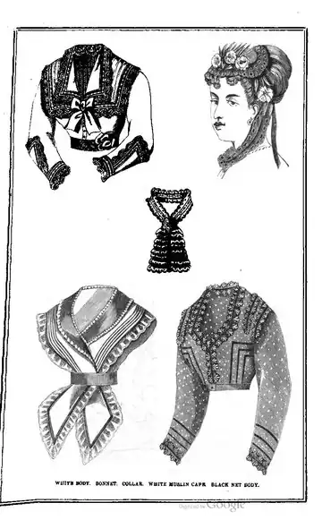 WHITE BODY. BONNET. COLLAR. WHITE MUSLIN CAPE BLACK NET BODY.