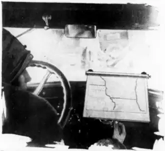 Attached to the windshield with rubber vacuum cups, an auto map rolls up like a shade when not in use, and is always in handy position. It occupies but little room, does not obscure the view when shut and is protected from dust and the weather in its holder.