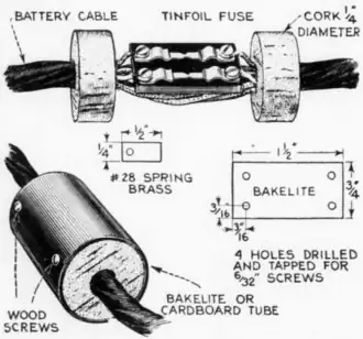When a set of radio tubes are accidentally burned out or the batteries are short circuited and discharged, the radio owner begins to think of safety-first methods and ways of preventing these expensive accidents. In the drawing is shown a fused battery cable. This will give protection to the tubes and it is easily and quickly made. About 1 ft. from the end of an ordinary battery cable, the braided covering is removed, leaving the insulated battery wires exposed for about 2 in. In the center of each of two large bottle corks, a hole is drilled to permit the corks to slide over the cable. They are then fastened on the cable with glue at the place where the braided covering was removed, the exposed battery wires being between the two corks. For the fuse base, a small piece of bakelite is cut and drilled as shown in the drawing. Small brass clips, to hold the fuses, are fastened to the base with screws. These clips make it easy to renew the burned-out fuses. The B-negative and A-positive leads are cut and connected to the fuse clips. Fuses are made from the tinfoil that comes wrapped around candy and chewing gum. It is cut in strips, 1⁄16 in. wide, for the A-battery fuse, and about 1⁄32 in. wide for the B-battery fuse. A bakelite cardboard tube is used for a cover; this slides over the corks and protects the fuses from accidental breakage or from being short-circuited. The cover is held in place by small wood screws.—R. J. Williams, Chicago.