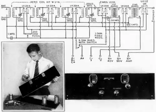 Above, Schematic Diagram; Lower Left, Front Panel Drilled, Showing Holes for Drum Dial Windows; Right, Front View of Assembled Panel