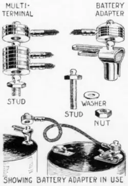 Good electrical and mechanical connections are the features claimed for the "snap" type of battery terminal shown in the illustration. Small round-head studs are provided on the receiver instead of regular binding posts, and the terminals snap tightly on these studs. A multi-terminal can also be obtained. for use when two or three leads must be connected to the same stud. Vibration does not loosen these fasteners, as is the case with leads that are attached to the common type of binding post.