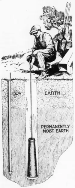 An efficient radio ground, having a "discharge area" several times as great as a driven ground, is now available. Its walls are of heavy sheet copper, rolled into the shape of a truncated cone. A 20-ft. length of heavily enameled lead-in wire is provided, and its connection to the ground proper is made by two heavy spot welds. There are no other soldered or bolted joints and, thus, no electrolytic action is possible. The interior is filled with pure grain charcoal, which absorbs and holds moisture. The device itself, the cap being removed when it is installed, acts as a reservoir for water, providing the lowest possible resistance. Compact and convenient to handle, the unit is installed in a hole bored with an ordinary post-hole auger, no large excavations are required, and the earth adjacent to the ground need not be disturbed. The sketch shows, at the left, the comparatively small area a driven ground exposes to the moist earth and, at the right, the much greater area for discharge obtained with the new type.