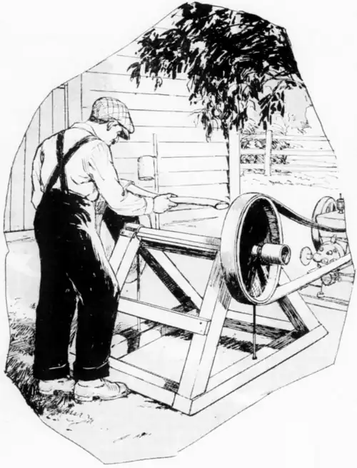 A Nebraska power farmer, who employs a large circular saw each winter for getting stove wood in shape, finds other uses for the machine. During the haying season he removes the saw and puts the grindstone in its place. Of course, the drive shaft is turned at low speed, about 150 r.p.m., by putting the belt onto a 4-in. pulley on the 4-hp. engine which is used to drive it. Another use to which the saw frame is put is for twisting cable for fence-corner braces. The frame is braced against end strain and the several strands are attached to the shaft. The other ends of the wires are fastened to the rear end of a heavy farm wagon. As the wires are twisted together, the over-all length is reduced. A man stands in the wagon with his hand on the brake and as the tension grows stiff, the brake is loosened just enough to permit the wagon to be drawn slowly toward the saw frame. When the wires have been twisted enough, the belt is thrown and a block of wood is held against the fly wheel to prevent too much back spin. Sometimes long pieces of cable, 100 to 200 ft., are twisted at one time and are later cut up into smaller lengths of proper size.—Dale R. Van Horn, Walton, Nebr.