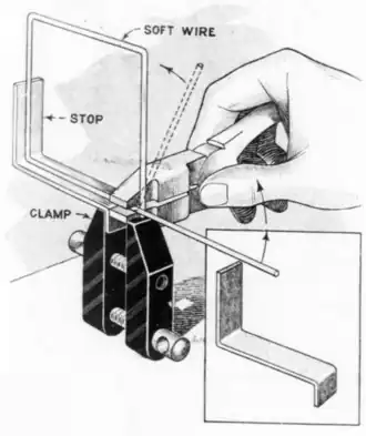 Soft wire up to 1⁄8 in. in diameter can be most conveniently bent with the aid of a pair of pliers and a simple stop piece, clamped in place as shown in the drawing. As an example of what can be done with this device, a number of wire squares can be made exactly the same size. The stop is made and attached in a few moments and the whole batch of pieces finished quickly. A length of strip metal is bent at right angles at both ends and clamped to the side of one of the plier jaws. To make a right-angle bend, push the wire tip to the stop and bend it close over the other jaw.