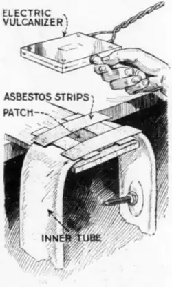 In vulcanizing small patches on inner tubes with an electric or gasoline vulcanizer, a Wisconsin repairman claims that the portion of the tube covered by the patch is apt to become overcooked or burned, and thereby weakened. To overcome this trouble, he uses four strips of asbestos paper over the tube. as shown in the illustration, leaving only the patch exposed to the full heat of the vulcanizing plate.