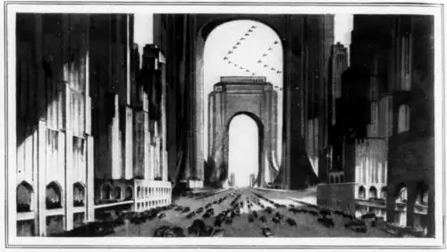 Street of the City of the Future, with the Arches of a Vast Suspension Bridge, Such as Has Been Started across the Hudson to Link New York and New Jersey, in the Background
