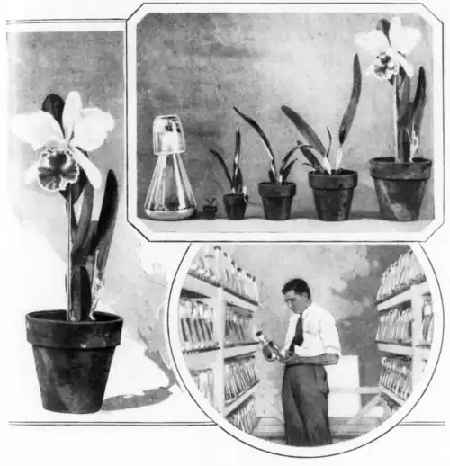 Orchids grow wild in parts of the tropics, but cultivating them under glass at a California farm is a task requiring skill and patience, for it takes nearly five years for a plant to mature from the seed and only about one seed in a million produces blossoms. The flowers will remain fresh and colorful for three weeks to three months, if left on the plant, and from ten days to two months in water after cutting. Healthy plants can be counted on to live for fifty to 100 years if properly tended. How successful cultivation has reduced prices is shown in the case of one variety that formerly sold for $1,250 a plant. It can now be purchased for $15. The California producers are trying to grow and orchid twelve inches across.