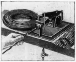 As a substitute for the slower method of removing insulation from wire with pliers or other tools, a stripper now on the market is intended to save time and work. It has two notched steel jaws, which are snapped around the wire simply by depressing a floor pedal. This cuts the insulation without touching the wire, and an easy pull slides the covering off.