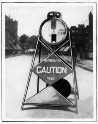 Three policemen were formerly required to regulate traffic in a London street, but since the installation of a special signal device, only one has been needed. The unit is operated by a control at the center of the street and shows, at either end, whether the course is clear for more traffic, thus saving communication of the "all-clear" signal by hand. The device has proved so successful that it is planned to install it at other places where suitable.