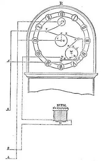 a pin (p) on the wheel (W) coming against the arm (I) of the forked lever (Y) raises the flexible arm (G) against the upper contact (D), so that the circuit of the local battery (U) is closed through the starting magnet (M), which operates the one o'clock train-work.