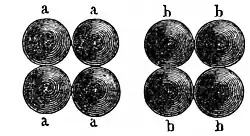 Fig. 19. is their tetrad arrangement. Hence the tetrad grouping of the ultimate particles, and therefore crystallization, is caused by an agent which acts like electricity. Very probably it is electricity itself, as is evidenced by the electrical properties of certain crystal forms, which appear to establish an intimate causal connection between the structure of crystals and this agent. This is illustrated in many so-called hemimorphic forms: these are forms in which opposite ends of a crystal, instead of being bounded by faces of the same form, are bounded by faces belonging to different forms. This phenomenon occurs in
