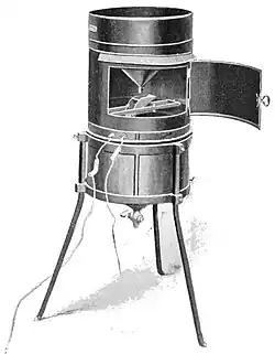 The recording rain gauge consists of a cylindrical casing supporting an open funnel above and a reservoir below. Beneath the mouth of the funnel is a pivoted tray or "bucket" divided into two compartments and pivoted so that it can be tipped to bring one compartment under the funnel mouth; and, when that is filled with rain water, it will be overbalanced and tip down, thus pouring its water into the reservoir and bringing the empty compartment under the mouth of the funnel. This tipping of the bucket momentarily closes an electrical circuit including the sunshine-recording magnet of the triple register, and causes the pen to follow a motion in general like the sunshine record, but so irregular as to time, and having either more or less steps in a given time according to the rapidity of the rainfall, that it is