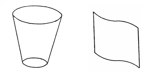 | Fig. 11.—This represents an ordinary table-glass, the bottom of the glass and the entire rear side, except the upper portion, being seen through the transparent nearer side, and the rear apparently projecting above the front. But it fluctuates in appearance between this and a view of the glass in which the bottom is seen directly, partly from underneath, the whole of the rear side is seen through the transparent front, and the front projects above the back. | Fig. 12.—In this scroll the left half may at first seem concave and the right convex, it then seems to roll or advance like a wave, and the left seems convex and the right concave, as though the trough of the wave had become the crest, and vice versa. |