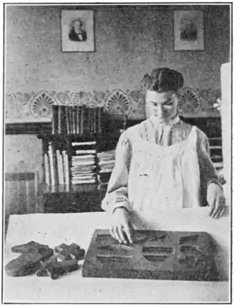 Fig. 5. Placing Blocks in the Form Board. With this form board, another type of test used in America, the child is required to place the ten blocks as rapidly as possible in their respective places. The experimenter observes and notes superfluous and jerky movements, the adoption of a method or system, i. e., hunting the block to fit the space and vice versa, the ability to profit by experience when the test is repeated, the ability to increase a set pace of procedure, the degree of sustained attention, the span of motor control, and many other phases of mental expression. One bright boy of ten recently placed the blocks in their respective places in twelve seconds and a defective of nineteen required, after much urging and many vacillating and uncoordinated movements, seven minutes and eighteen seconds. Dr. Healy, psychopathologist for the Chicago Juvenile Court, has modified this type of form board by having the geometric forms a part of a puzzle picture which covers the face of the board.