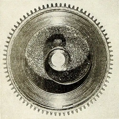 The vibrations of the balance-wheel are the result of the action of two forces, one being the force of the mainspring acting through the “train” of wheels and the escapement, to turn the balance-wheel on its axle, and the other being the opposing force of a very small spring, known as the hair-spring, coiled loosely about the balance-wheel, and which thus tends to regulate the power of the mainspring.
