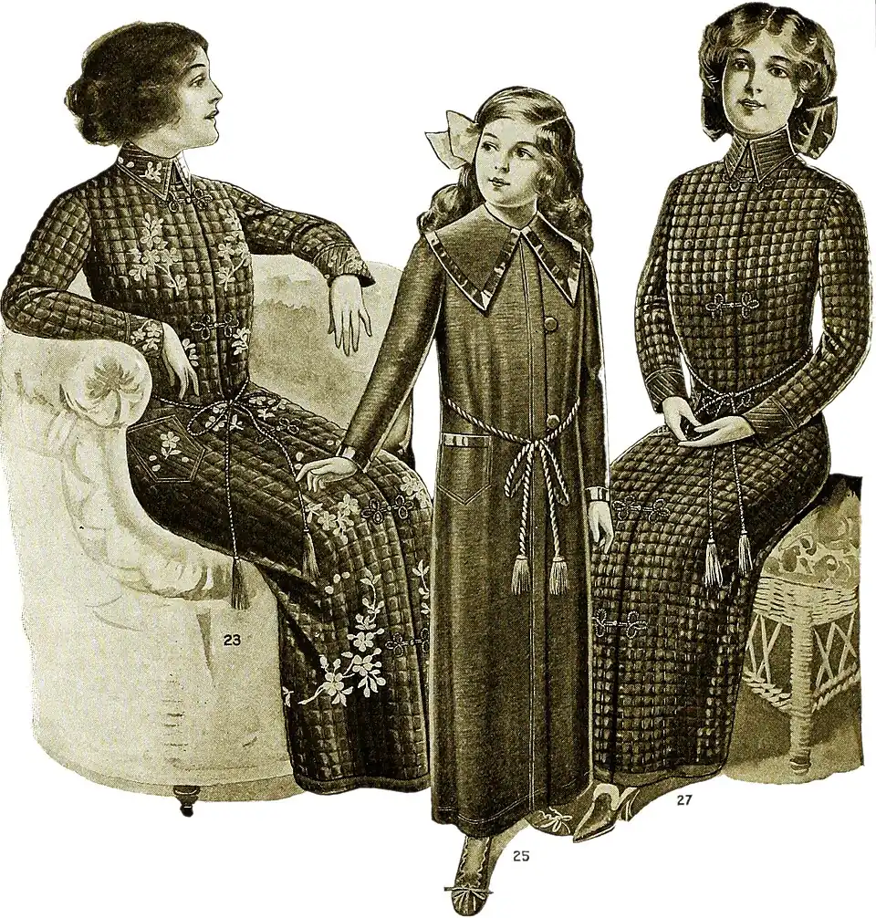 | No. 23—Hand embroidered, imported Japanese Quilted Silk Gown, in navy, light blue, red, old rose, or pink, lined with silk in contrasting color, fastened with silk frogs, cord, and tassel; 4, 6, and 8 years | 6.95 | No. 25—Crêpon Eiderdown Wrapper in red, light blue, or pink, trimmed with satin to match; 2 to 4 years | 1.85 |