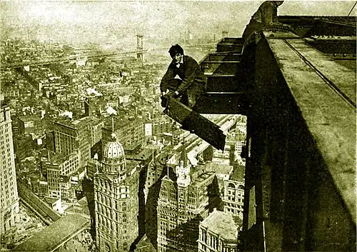 We climbed on up to the thirty-sixth story, and found no flooring except some boards here and there. That ladder did not take us any farther, but we saw one off to the right at the outside of the building. Up this ladder Will climbed, and I followed him. The wind was blowing so hard that most of the time I had to hold my hat on. And there, far, far below us, was the street—500 feet sheer. The ladder was a double one, like the others, but was not secured; and, to make matters worse, half-way up there was a temporary platform which projected across our path, so that we had to reach far out on one side and worm our way past it. When we reached the thirty-seventh story, I determined that I had had enough. There was absolutely no flooring above me except a pile of planks and no flooring on the story above that; but the thirty-ninth apparently was provided with a complete plank flooring.