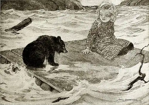 “Neither had come voluntarily into this strange fellowship; and it would have been hard to say which of the pair regarded the other with most suspicion. The bear, to be sure, at five months old, was more grown-up, more self-sufficing and efficient, than the baby at five years; but he had the disadvantage of feeling himself an intruder. He had come to the raft quite uninvited, and found the baby in possession! On that account, of course, he rather expected the baby to show her white, little teeth, and snarl at him, and try to drive him off into the water. In that case, he would have resisted desperately, because he was in mortal fear of the boiling, seething flood. But he was very uneasy, and kept up a whimpering that was intended to be conciliatory; for though the baby was small, and by no means ferocious, he regarded her as the possessor of the raft, and it was an axiom of the wilds that very small and harmless-looking creatures might become dangerous when resisting an invasion of their rights.