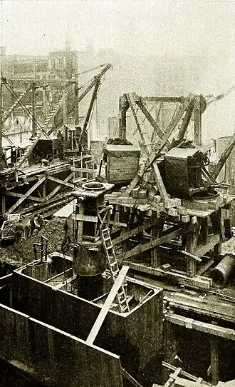 AT WORK ON THE FOUNDATIONS OF A SKY-SCRAPER. IN THE FOREGROUND IS A NARROW WOODEN CAISSON.