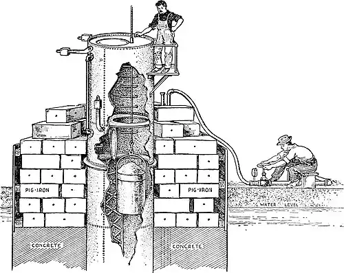 When, at last, we reached the bottom of the shafting, we wriggled down a rope ladder to the ground. The working chamber was rectangular, measuring about ten by fifteen feet; five sand-hogs were at work. They had dug a wide hole in the sand at the center of the chamber, and were extending it toward the sides. Mr. Squires explained that they would dig to the edge of the chamber, undermining the edges of the caisson if necessary, so that they would sink into the ground. The deck, a foot or so above our heads, was made of heavy timbers, and supported a concrete pier that extended in a solid mass eighty feet above us. The shaft was getting so deep that the weight of the concrete was no longer enough to force it down, and tons of pig-iron were loaded on top to overcome the friction of the earth on all sides of the caisson.