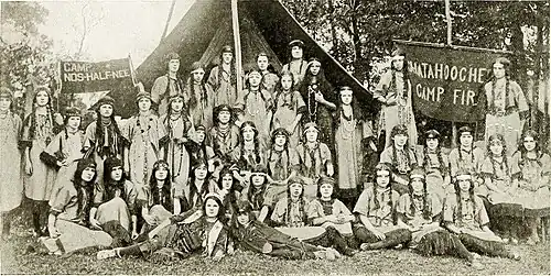 Naturally, the Camp-Fire Girls should understand Camp Craft, and they have a long list of methods for erecting and keeping the tent, selecting a proper location, making a shelter and a bed of material found in the woods, making a bed on the ground and sleeping on it out-of-doors for five nights, doing for one day camp cooking for four or more persons without help or advice. This includes getting wood and making an open fire. One must know Weather Lore, how to follow the trail, to tie knots in strings and ropes, to do clay modeling, brasswork, silver work, dyeing, basketry, wood-carving, carpentry, textile work. The girls are also instructed in business, and thoroughly trained in patriotism, including the proper celebration of all the principal holidays; they are taught the conservation of streams, birds, trees, forests; the beautifying of front yards, and a knowledge of the history of the country.