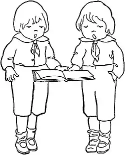 This delightful book contains twelve songs of much beauty and simplicity, each accompanied by illustrations printed in four colors. These pictures are characterized by an old-fashioned quaintness and humor; the “little boys” belong to the long ago, rather than to the present prevailing school of child-life illustration. In the verses is found, to a remarkable degree, that indefinable understanding of the way that little minds think and feel which is a gift of the very few.