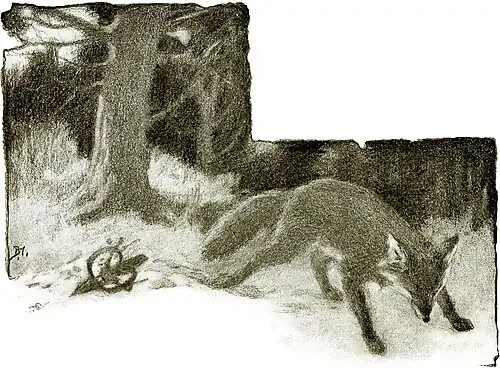 On the next night Silver-gray was trotting through the forest when he smelled a very bad odor, like rancid fish-oil, and when he followed it up, he cane to a great rock at the base of which lay a fine grouse, newly killed, and the fresh meat lay all bloody before him. So rank was the odor of fish-oil that Silver-gray did not catch the smell of man in the feathers, and in a twinkling he devoured the whole bird. But as he trotted along the trail he scented the odor of man.