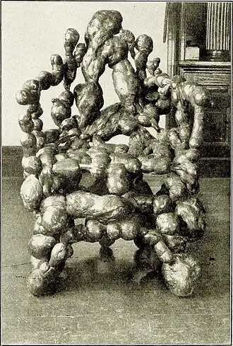 The chair is three feet four inches in height and twenty-four inches in width. The wood, which is as hard as oak, is golden brown in color, and since the bark has been removed has taken on a fine polish, Some of the knots that formed between the binding ropes are twenty-one inches in diameter. Though the chair has a lumpy appearance, it is fairly comfortable.