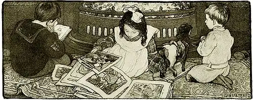 that when he got home he hurried to get warm. Kneeling down close in front of the coal fire, which flamed and crackled in the open fireplace, while his brother and sister looked over their Chrisimas portfolio of pictures, he gazed into the glowing coals in the grate. By and by he climbed up into an arm-chair. The heat made him sleepy. and he closed his eyes. He opened them in great astonishment a moment later, when he heard a shrill “Cock-a-doodie-doo!” which sounded very close to him. He knew there were no chickens in the room, because the chickens were all out on the farm in the country, and he was just beginning to think that he had been dreaming, when he heard the “Cock-a-doodle-doo” again. This time it seemed to come from in front of him, and he looked into the fireplace, though how a “cock-a-doodle-doo” could come from the midst of the fire he did not know, As his eyes fell on the fire he gave a jump in the chair and stared as hard as he could. There, in front of him, perched on a piece of coal, was a comical little rooster.