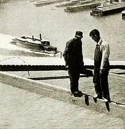 ![]() STRINGING THE LAST PAIR OP WIRES ON A CARRIER BEARING TIE STARS AND STRIPES. |