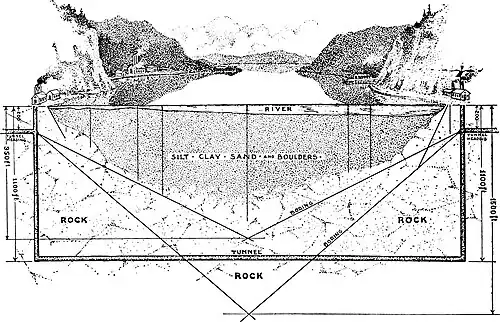 THE AQUEDUCT TUNNEL UNDER THE HUDSON 1100 FEET BELOW THE SURFACE. IN SEARCH FOR GOOD ROCK, INCLINED TEST-BORINGS WERE MADE FROM EACH SIDE OF THE RIVER, MEETING AT A DEPTH OF 950 AND 1500 FEET.