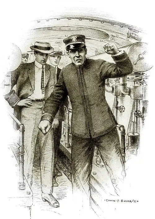 ‘There was a sharp command from our captain, in response to which the man in charge of the diving rudders turned a hand-wheel. The boat dipped and lurched forward. We watched the indicator hand travel slowly over the dial of the depth-gage. Five feet, ten feet, fifteen, eighteen, twenty—there we halted. We procceded for a time at that depth below the surface, I climbed up into the conning-tower, but could see nothing but the dense green which completely covered us. However, the ends of the periscopes were well above the surface, and navigation was a simple matter, I was allowed to look through one of the submarine’s eyes, and, while I was looking, the captain gave the command to dive. Presently, the water surged up over the top of the periscope, and instinctively I rose on tiptoes and drew in my breath, as if I were actually being submerged in the water. As we continued to sink, it was fascinating to watch the gage telling off the depth. At sixty-five feet below the surface, we came to an even keel.