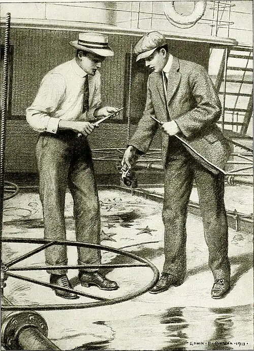 “That ’s a foolish question.” said Mr. Porter, “Stop and think about it a moment. Which is heavier, sand or water? Why should this boat sink if we swap a load of sand for a load of water? As the water comes in, the sand falls out, and the boat, relieved of the weight of the sand, actually rises ten feet higher out of the water,”