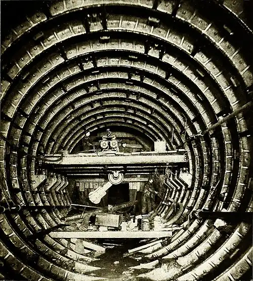 INSIDE THE TUNNEL SHOWING THE “ERECTOR,” BACK OF THE HORIZONTAL PLATFORM, RAISING A LINING PLATE TO POSITION.