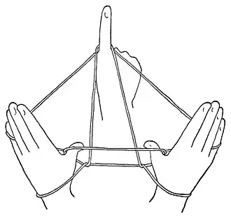 from the near side, the far cross string (the string crossing over the four strings passing to the other person) (Fig. 619). Then the second person withdraws the finger, and you separate the hands, put them in the usual position, and draw the
