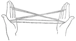 the left thumb and index. In the same manner, he turns the right near string once around the right hand. There are now two strings across the back of each hand and a single string across each palm.
