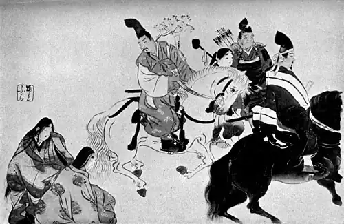 Tadanori, carrying the branch of cherry-blossoms on his back, set out on his journey
